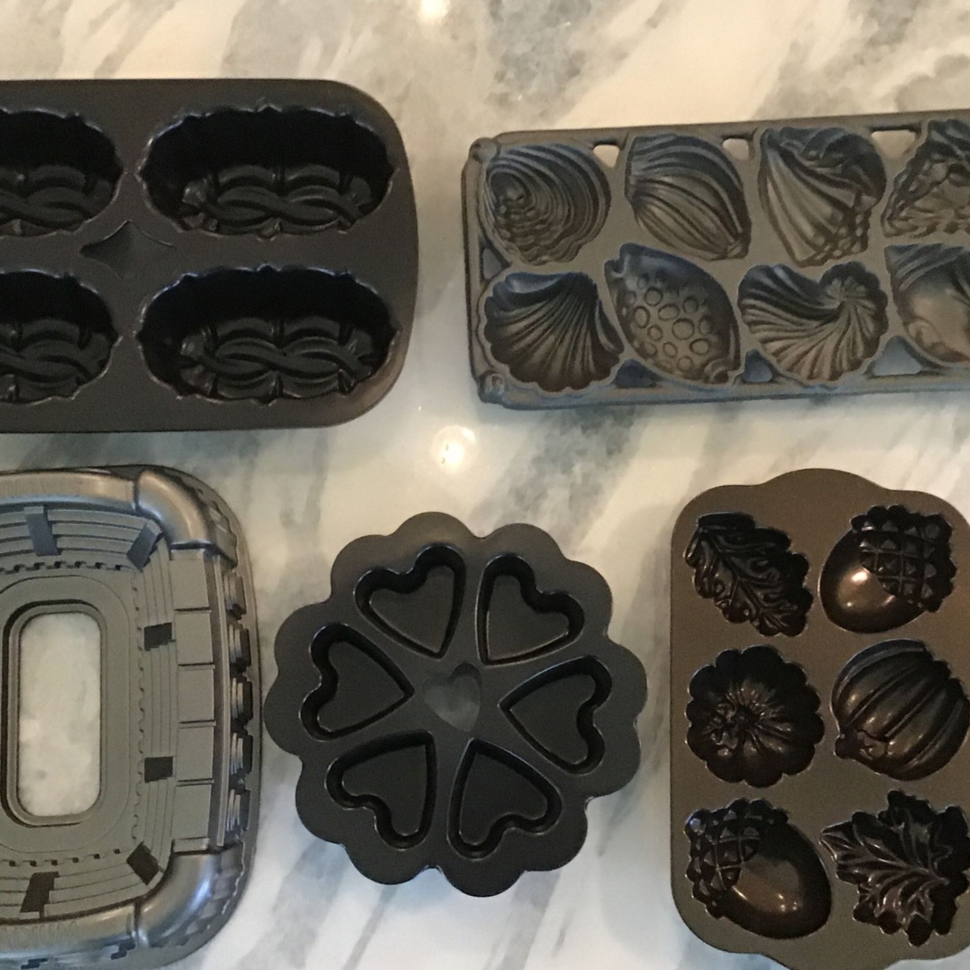 1 Nordic Ware Stadium; 1 Nordic Ware Autumn Treats; 1 Nordic Ware Mini Hearts; 1 Nordic Ware Bundt Loaf; 1 John Wright Sea Shell - cast iron, 1989 vintage All in perfect condition. Williams Sonoma.