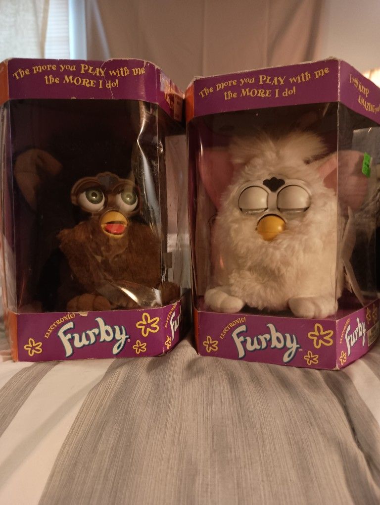 Vintage Furbys talk "furbish" Instructions inside the box on how to train them to speak "English" Really cool Vintage toy from back in the day. (1980's) Asking $60 each or both as a set for $100 Brown one named Chocolate White one named Snowball Comes with certificates
