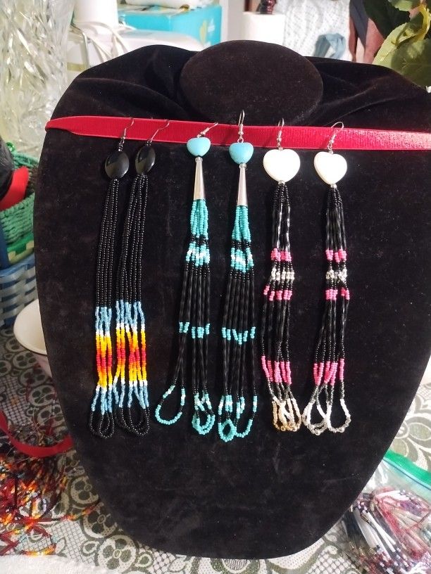 All hand made with beautiful color beads and turquoise heart beads,mother Pearl,and black stone beads ,each one has a unique look . $22 each pair
