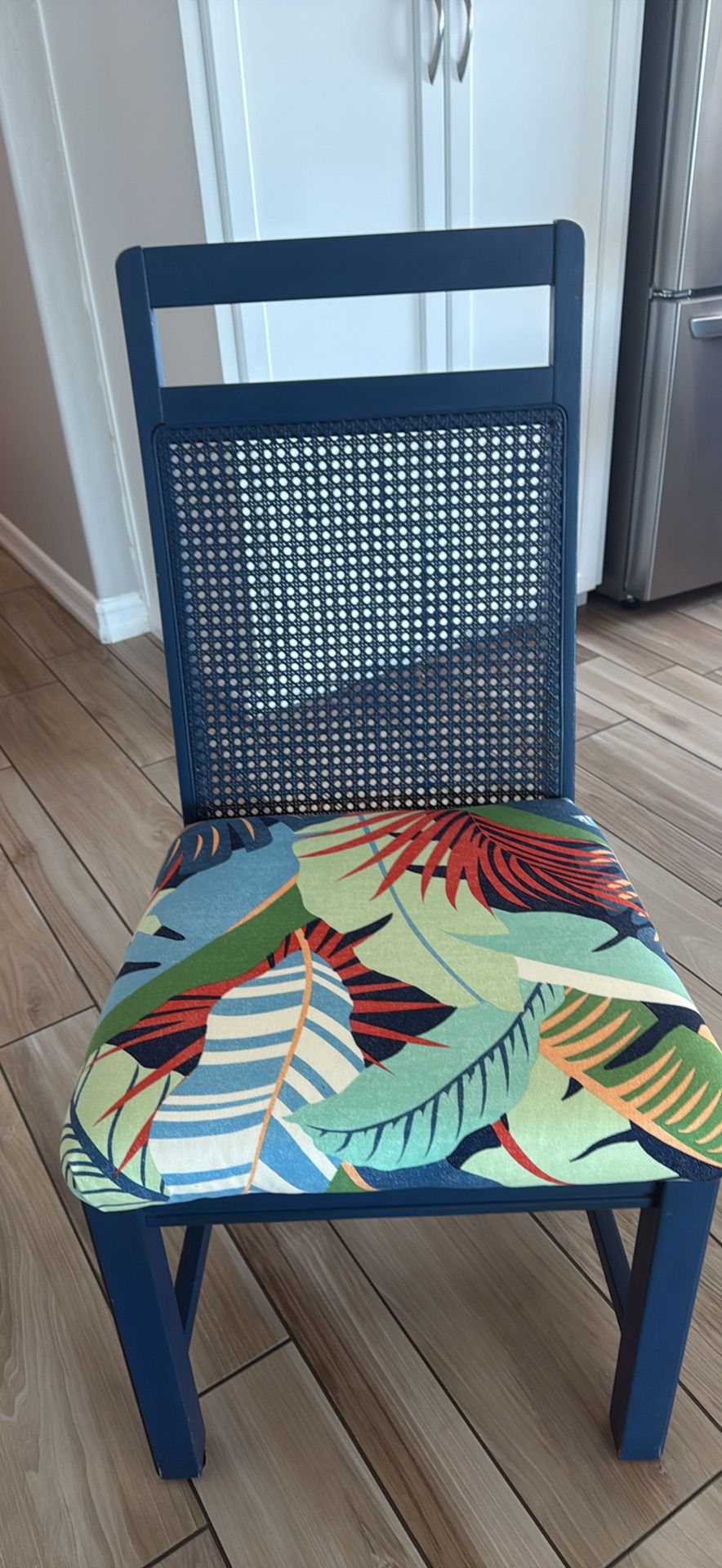 Set of 4 Navy Blue Cane Back Dining Chairs with tropical print cushions