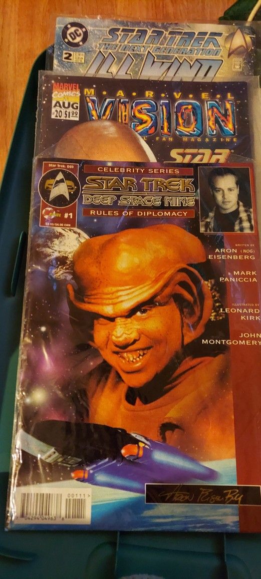 Collection of Star Trek items 12 next generation action figures with cards 7 Space caps next generation interstellar action LaForge no card Space talk series beware of borg 10 tv guides Borg cube 3 comics 2 key chains