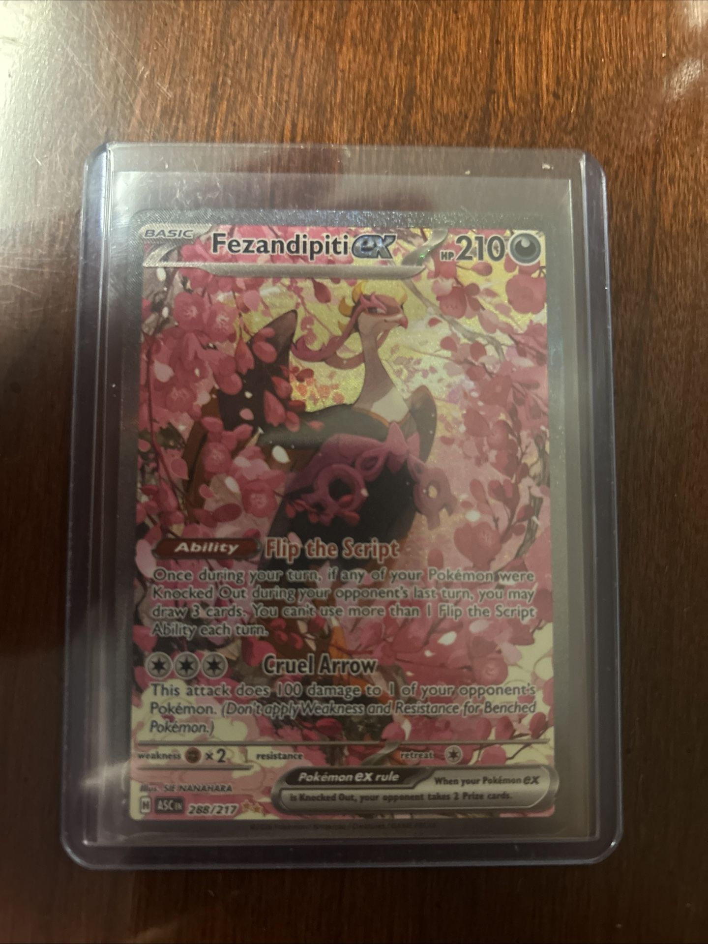 The Fezandipiti ex - 288/217 Special Illustration Rare from the Ascended Heroes expansion, illustrated by Sie Nanahara, features a stylized, artistic depiction of the Pokémon. As an alternate full art card, it showcases a dramatic, thematic scene with a unique, detailed artistic style focusing on the character's elegant yet menacing nature, often highlighted with deep, vibrant colors.