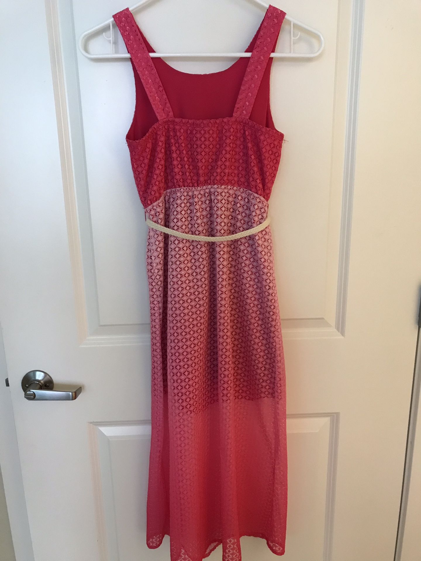 Girls size 8 long dress. Light and dark pink. Has belt. Underlay goes to knees and lace cover goes to ankles. Comes from smoke and pet free home