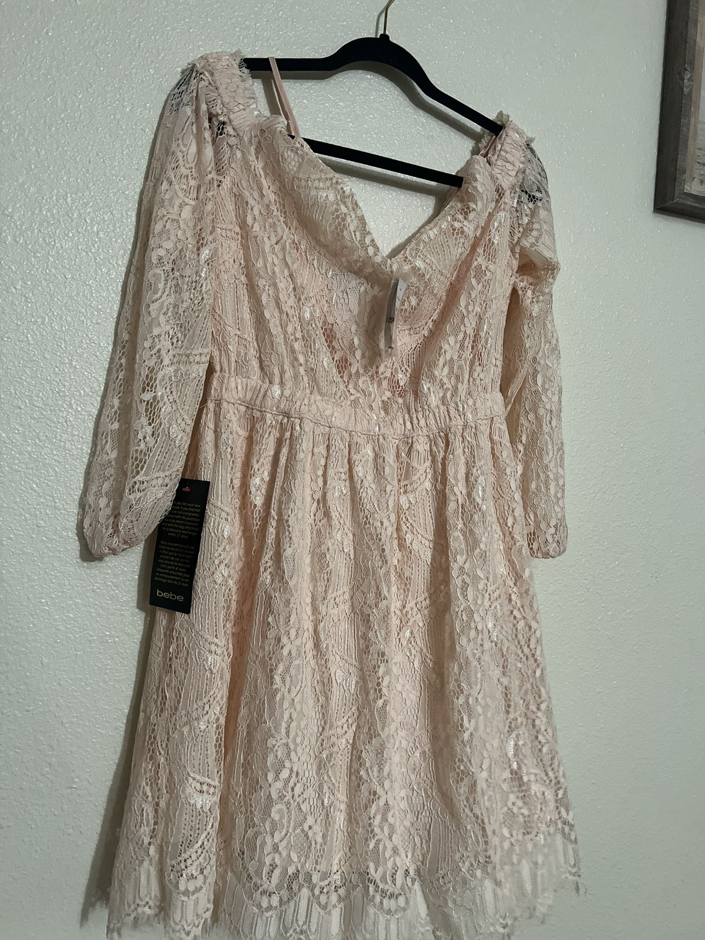 Beautiful pink bebe off the shoulder dress. New with tages. Size medium. Mia l/s cold shoulder dress.