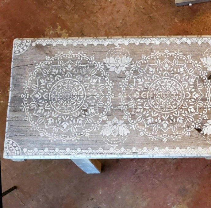 Indoor/outdoor bench made from reclaimed weathered wood with beautiful decorative mandala designs in ivory. $90 or best offer.