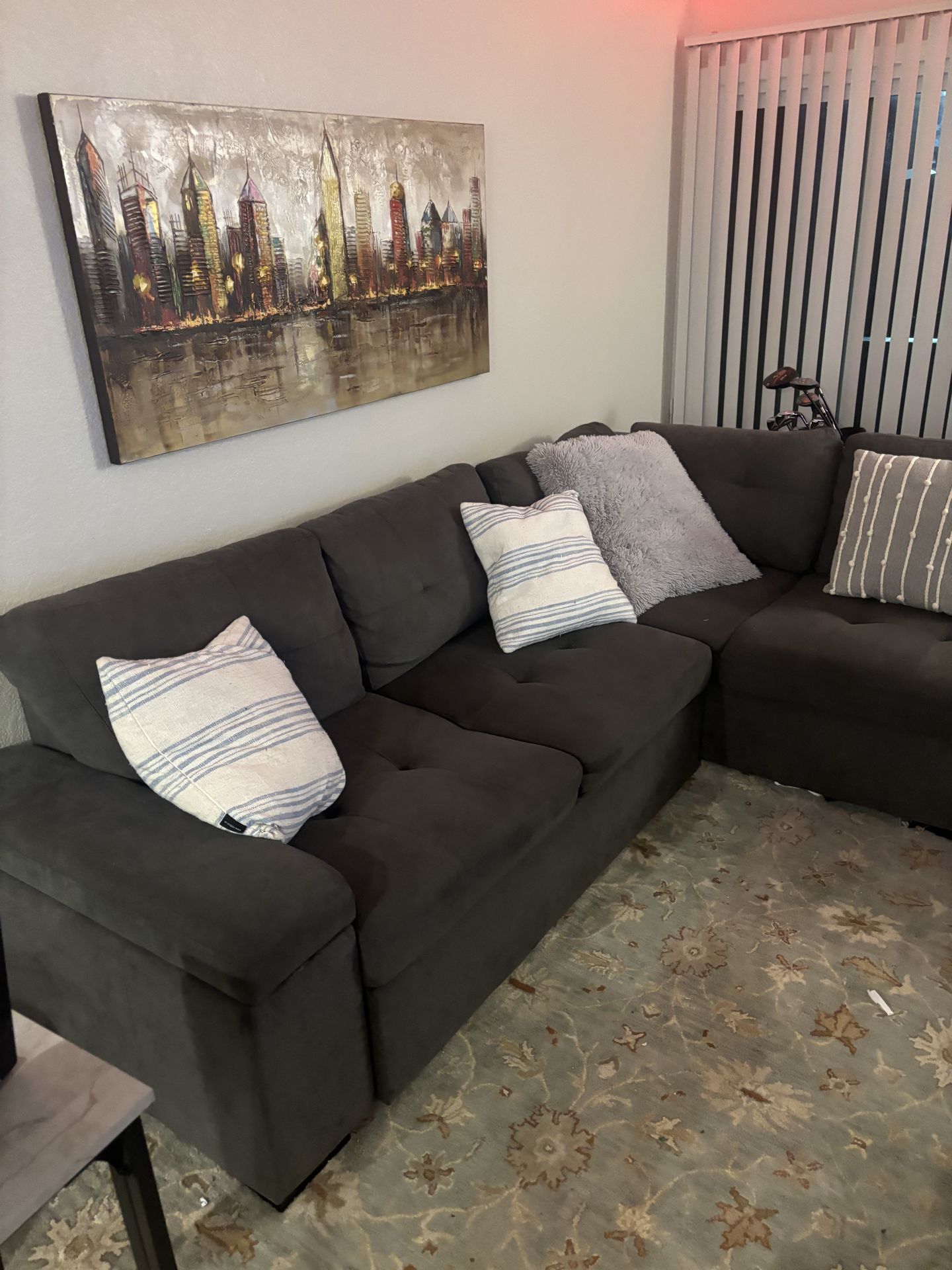 It’s about 7.5 feet long both ways and folds out into a bed. The couch was purchased brand new about 2 years ago and is in excellent condition. Local pick up only currently located in Simi Valley.