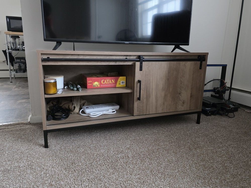 TV stand with sliding door. Well built and from a non smoking house. 48"L X 16"W X 24"H