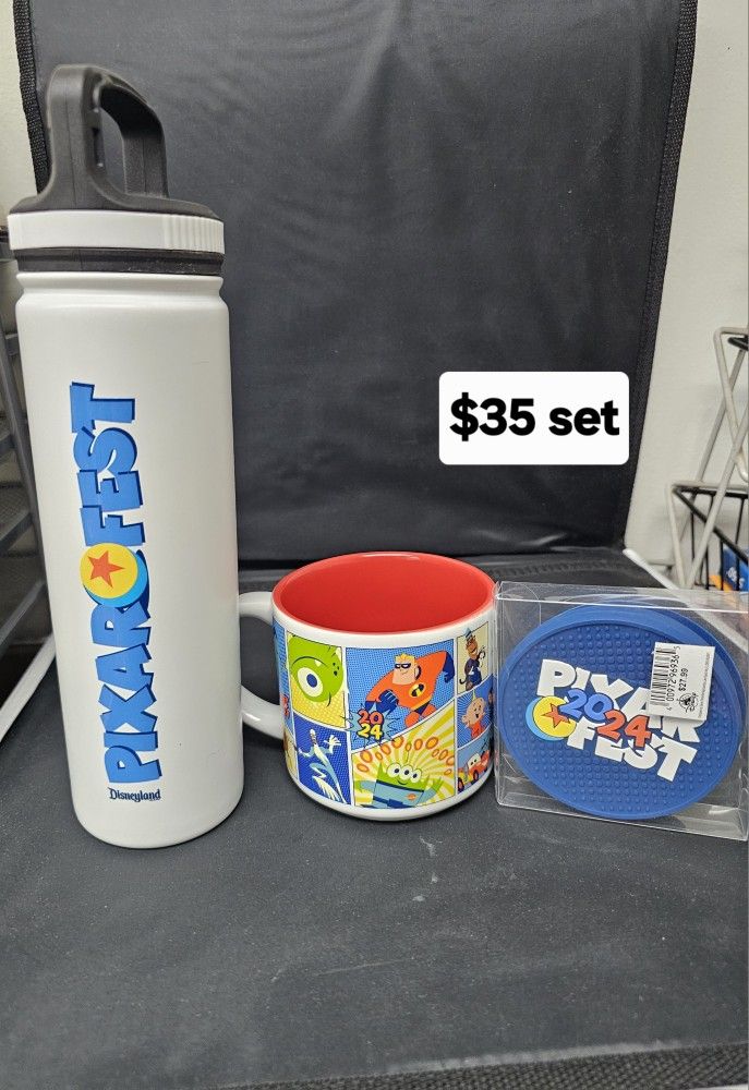 Disney Pixar Fest Water Bottle, Mug And Coasters Set I have 3 sets available