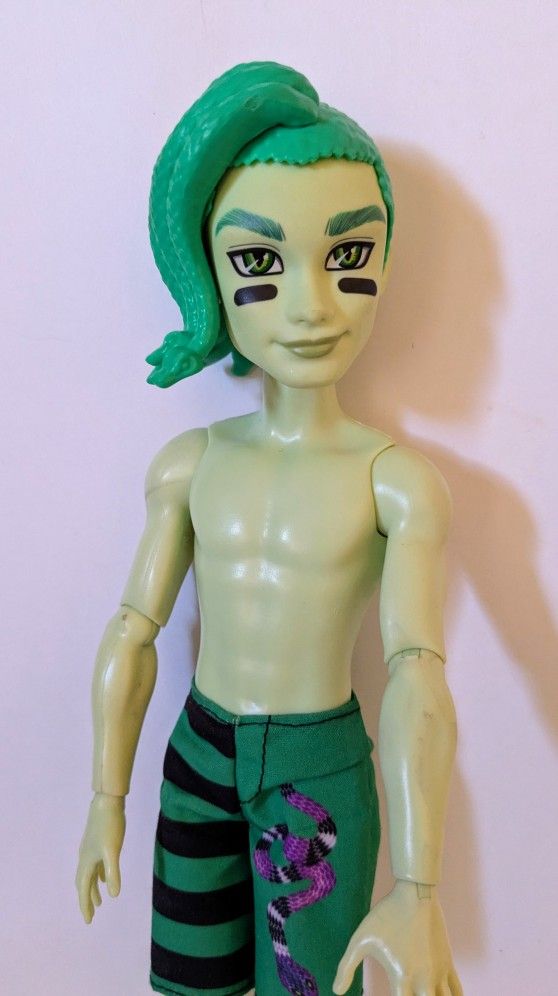 PLEASE READ DESCRIPTION AND LOOK AT PHOTOS!!! Monster High Deuce Doll by Mattel. I'm not sure if his a new or older Deuce. His missing a lot of things and I'm not sure if he has his original shorts. He does have a lot of black marks on him, he has a mark on his back, one on his arm, one on his leg, one on his hair, and on his ear, please see photos before buying. He left foot is also loose. He needs a new loving home with lots of TLC. Please see photos for full details as they are VERY IMPORTANT to his description. His from a smoke free home. Thank you so much for stopping by and taking a look.