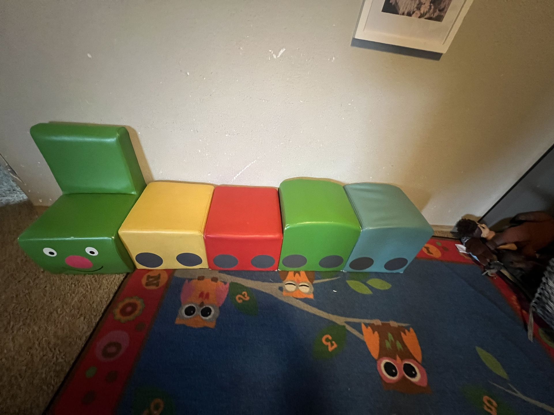 Set of colorful soft play blocks in caterpillar design. Five individual stools