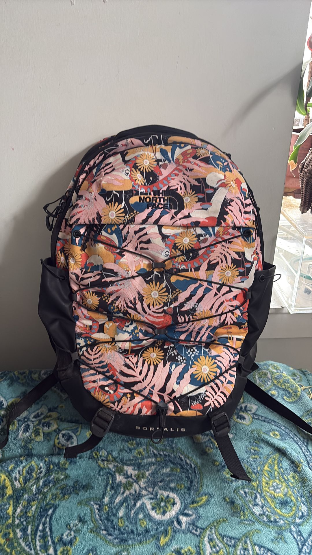 Item was used for school, has some scratches and wear, but still in great condition with a beautiful print! Great for all adventures!