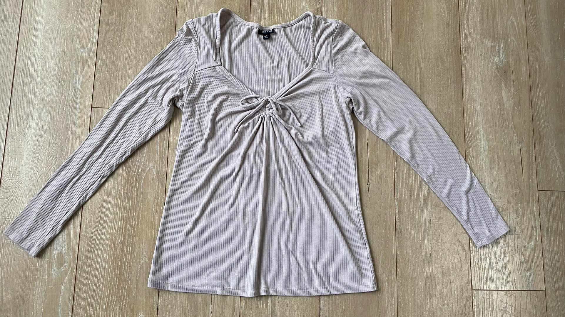 Elegant long sleeve tee with front knot detail. Comfortable and stylish.