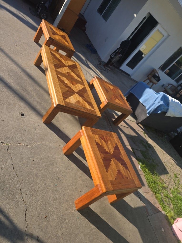 Vintage Solid Wood Center & Side Tables. Big one Measures Height 16in Length 58in Width 31in. Side ones Height 19in Length 30in Width 2ft Back one Height 19in Length/Width 30in.