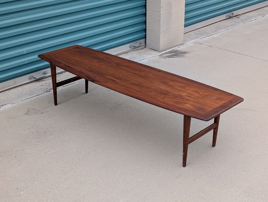 For your consideration is a surfboard coffee table in a walnut finish. Please note that center stretcher on the bottom is missing. Measures approximately 60"W x 18 x 15"H. Small brackets have been added by previous owner for support. Please scroll through all the pictures Delivery is available. If you have any questions, please feel free to reach out. For more vintage goodies: @Midcent_LA