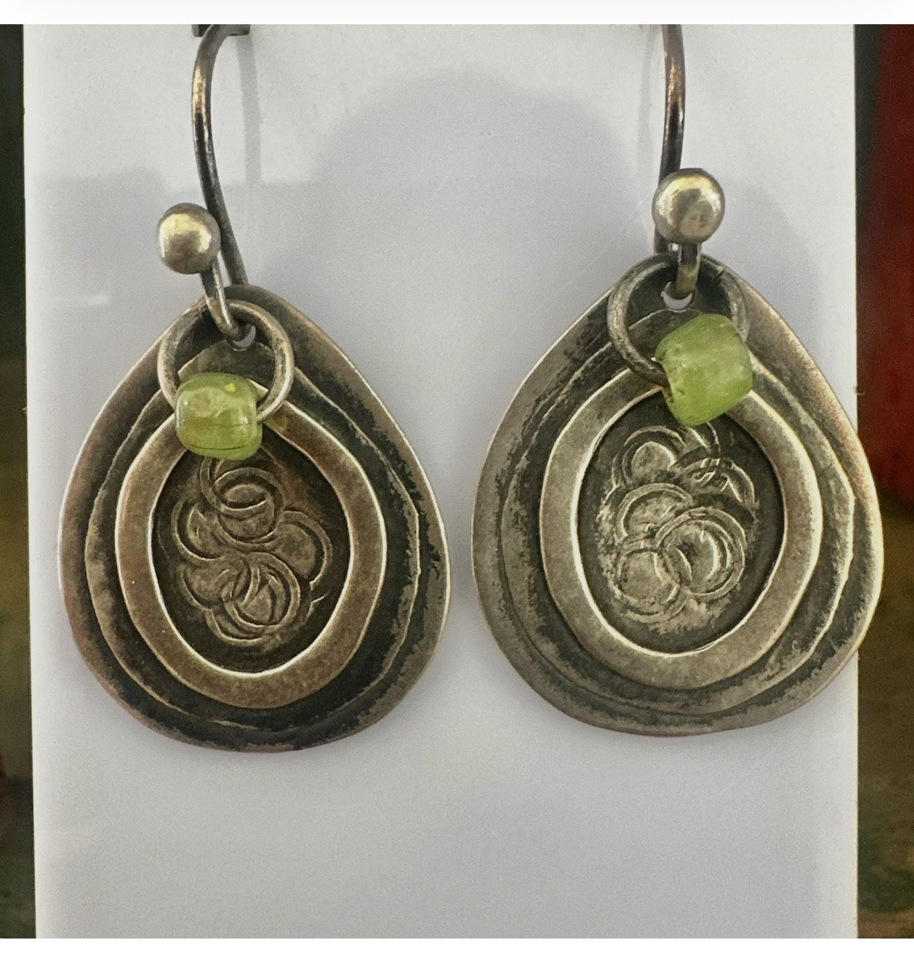 CH Sterling Silver Artisan Drop Earrings Green Stone Accents Designer CH handcrafted artisan drop earrings made of solid sterling silver with an oxidized, sculptural finish. Each earring features layered, organic teardrop forms with an engraved central motif and a small green stone bead accent near the top. Signed “CH” on the back and originally purchased from a gallery. These are cast sterling silver earrings, meaning they were created using a casting process rather than stamped sheet metal, giving them depth, weight, and a distinctly handmade feel. The green stone beads appear natural and unpolished Sterling silver hook ear wires. Earthy, artistic, and timeless — a beautiful example of gallery-style artisan silver jewelry. Pair with linen, denim, or other oxidized silver pieces for an effortless boho or modern artisan look. Very good vintage condition ✨ Natural patina and light surface wear consistent with handcrafted sterling.