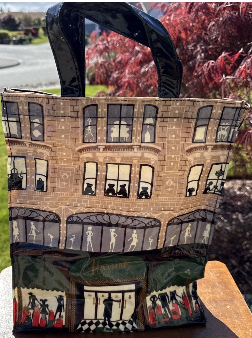 The Harrod's Tote Bag is a stylish and practical accessory for women, featuring a rectangular shape with a medium size perfect for everyday use. Made of PVC material with a coated finish, this tote bag showcases the iconic Harrods logo as a pattern, adding a touch of London charm. With double PVC handles, this versatile bag is both fashionable and functional, making it a must-have for any woman looking to add a touch of sophistication to her outfit.