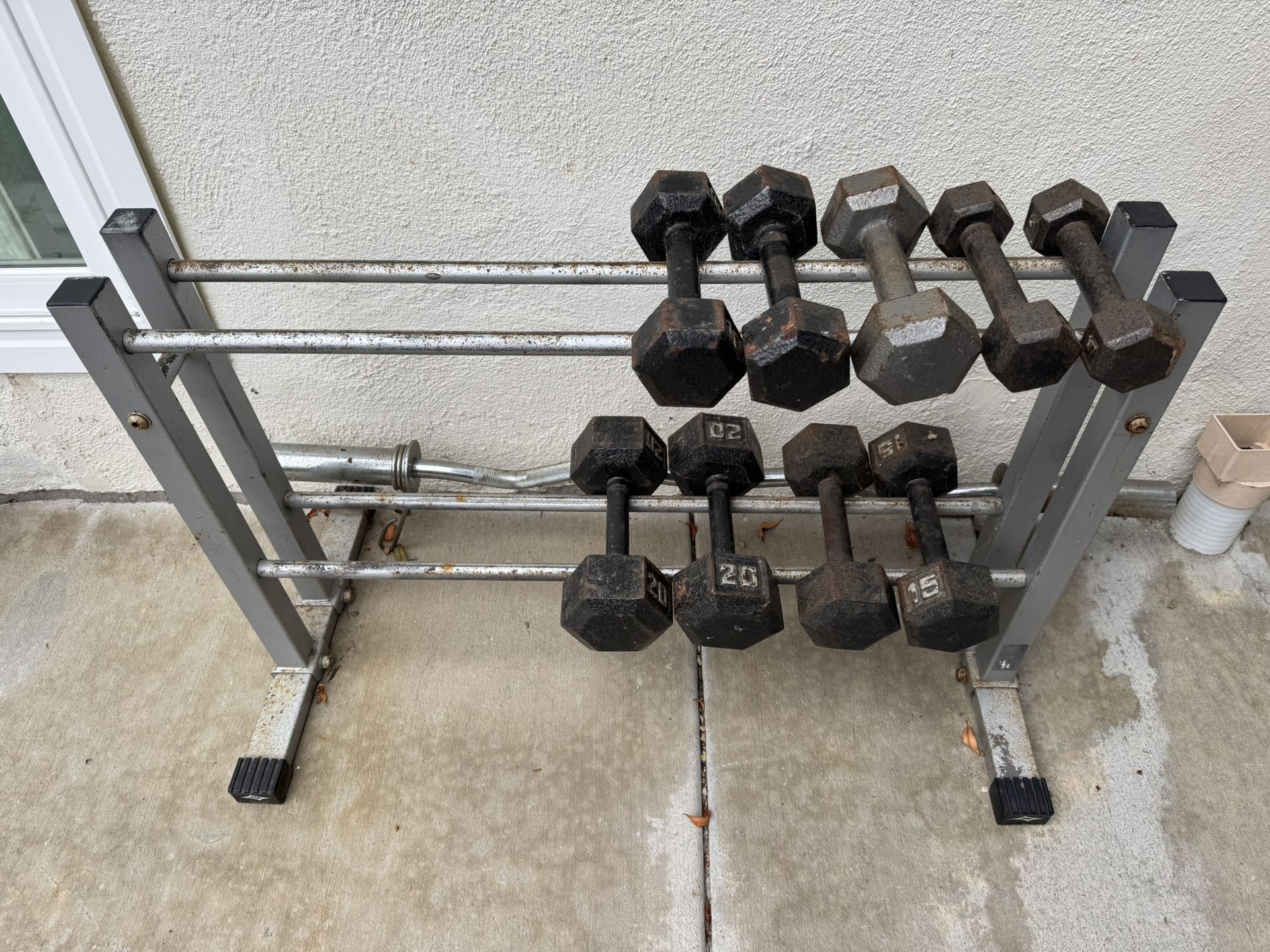 Price firm. Rack is old school, well made, strong and very stable. Could use some TLC. Holds the weight. Weights are 5, 10, 15, and 20lbs. Two of each.