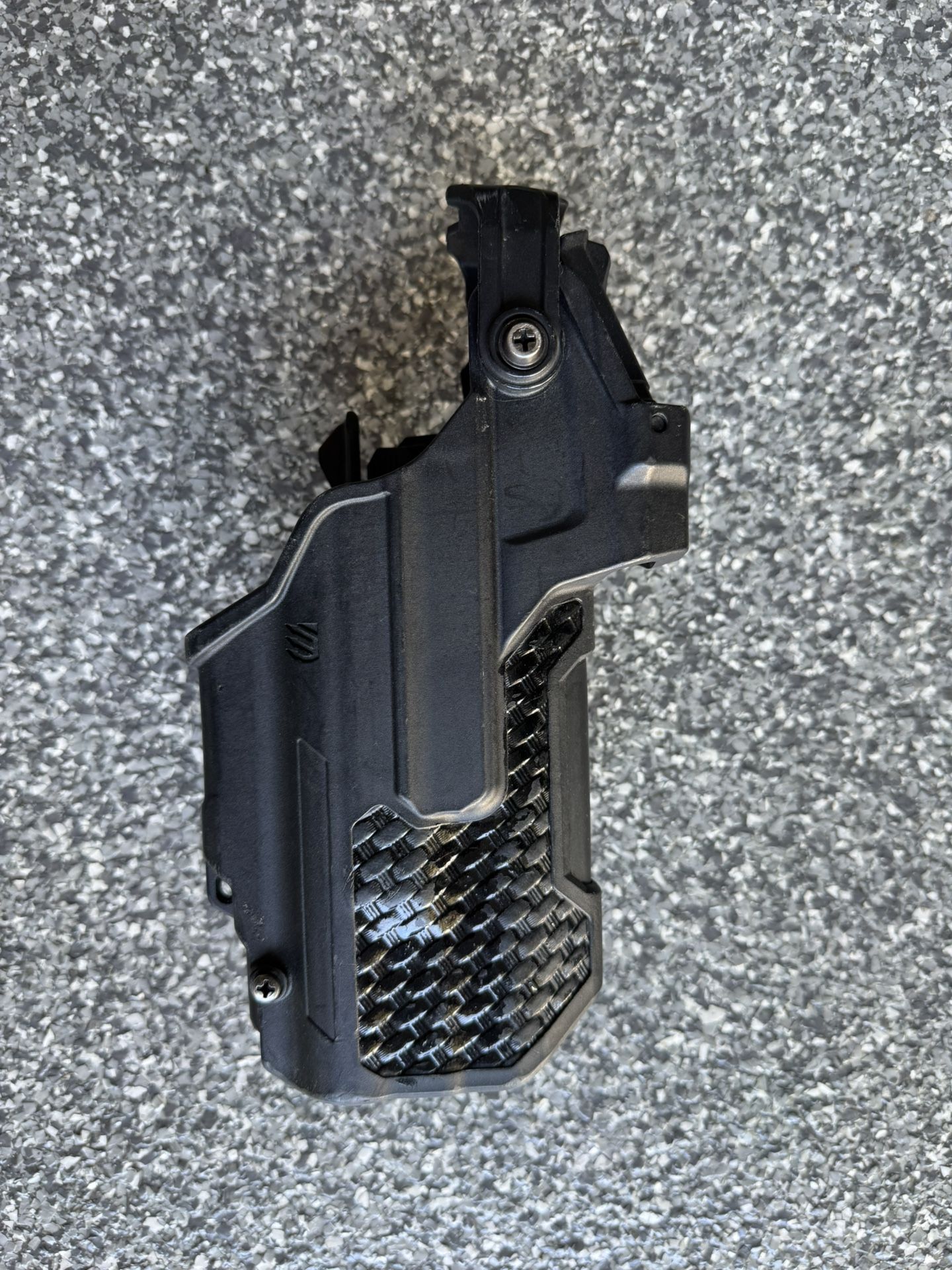 The BLACKHAWK T Series Level 3 Duty Holster is specifically designed for the Staccato P 2011 w red dot optic and Surefire X300 or X400 light . Right-handed shooters. Holster also includes a Safariland QD fork attached.