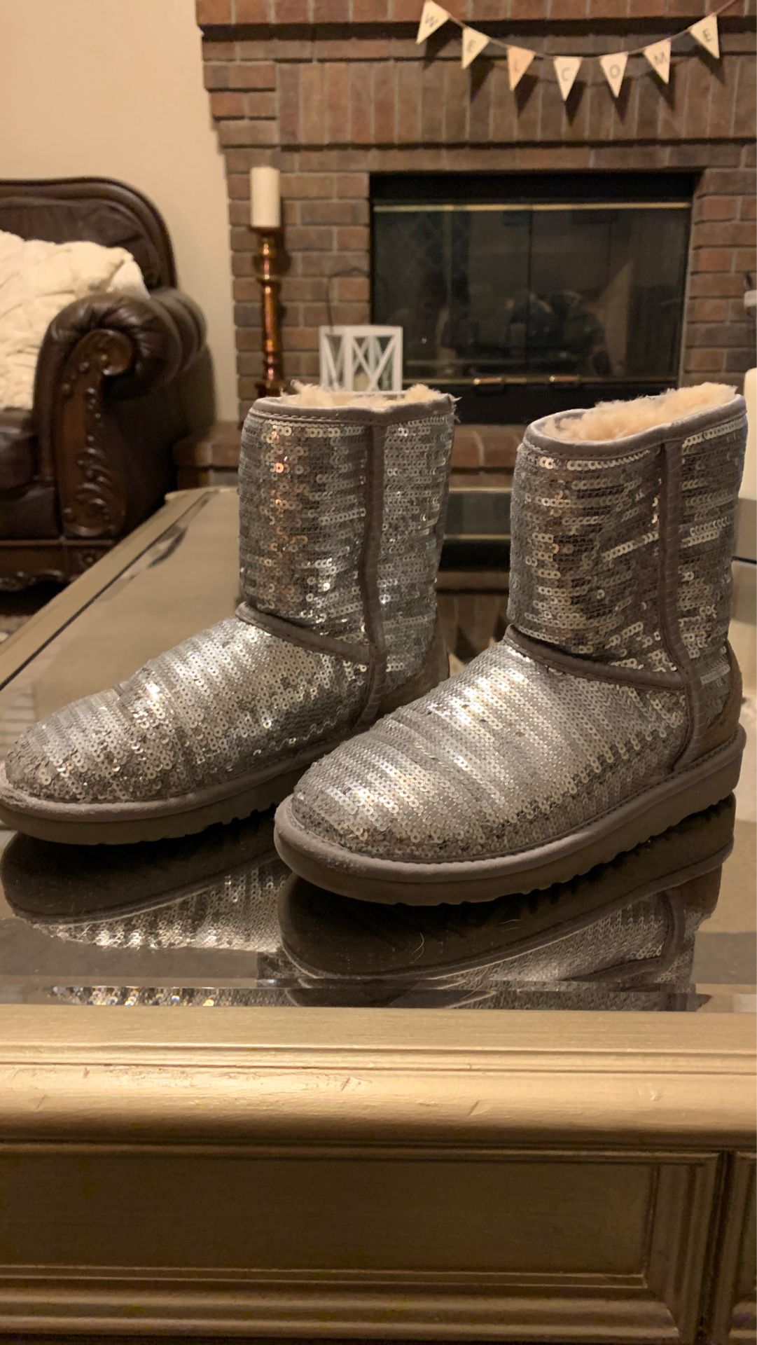 Adorable size 2 youth silver sequin Uggs in good used condition. $25 and their yours!