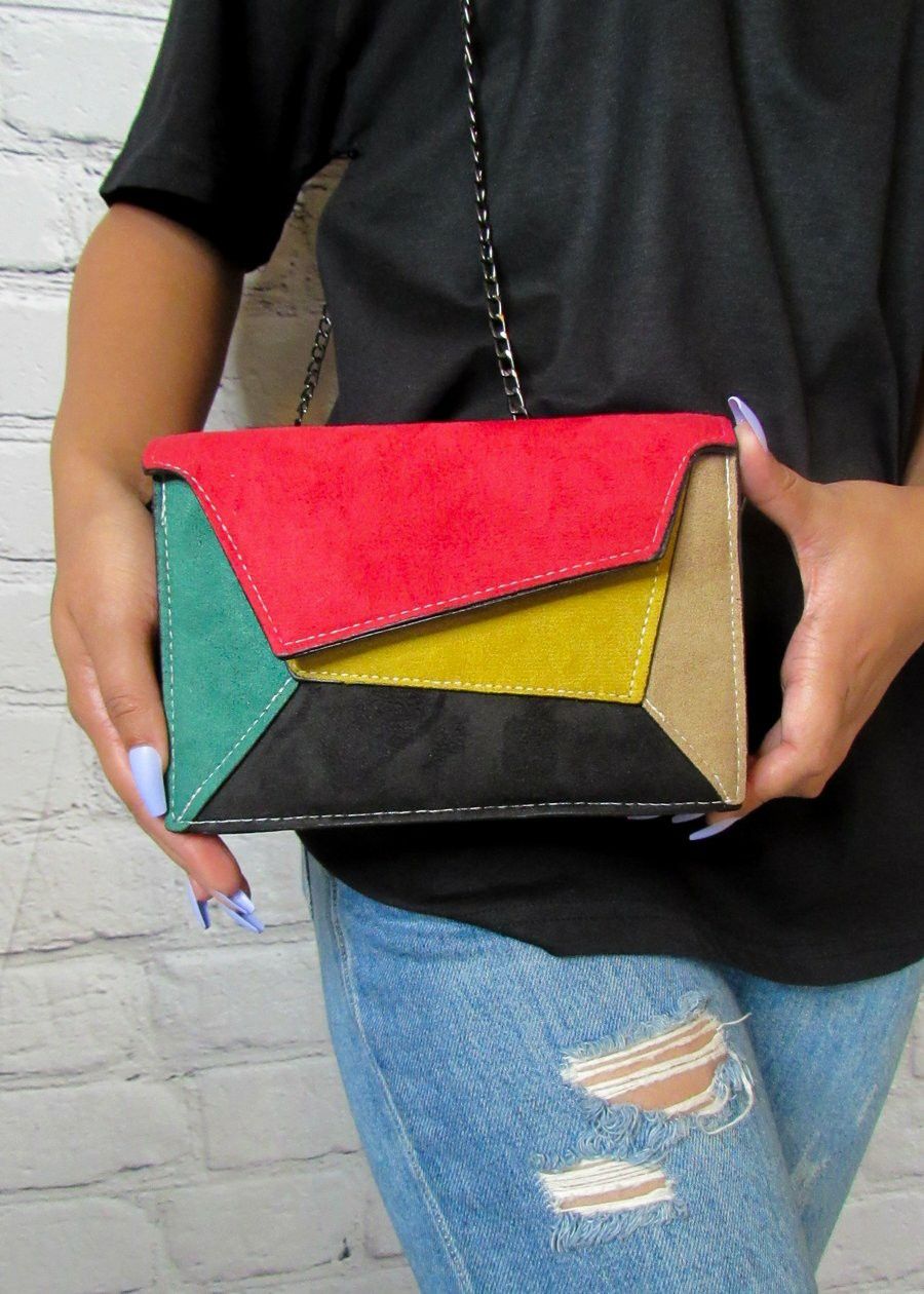 Brand New Color Block Handbags 3 Available ITEM DESCRIPTION: Type: Shoulder/Crossbody Bag With Chain Strap & Snap Closure Color: Multi Color (Red, Yellow, Tan, Green, Black) Material: PU Leather Measurements: 8 X 2.25 X 5 INCHES