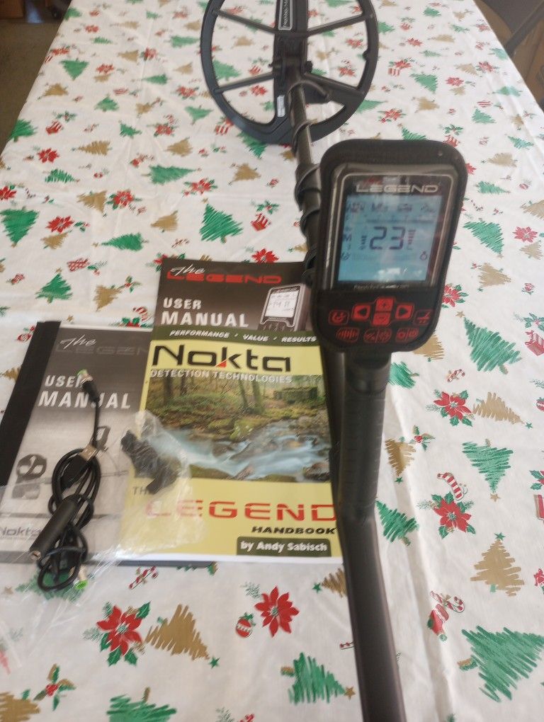 Nokta Legend Metal Detector in Like new condition. Still has original factory screen protector. Last Firmware Update v1.13. Including extra: neoprene control box cover, Nokta Legend Hand Book, Head Phone Adapter cable, ball cap never worn. Wireless Headphones are not included. Purchased new from Backwoods Metal Detectors on 3/15/2022