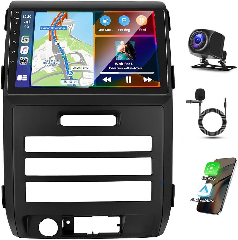 with Wireless Carplay Android Auto, 9" Touchscreen Android 13 Double Din Car Radio Receiver w/GPS WiFi Bluetooth SWC BT FM RDS Backup Camera, 2G+32G.. About this item 【Fitment】Our 2.5D HD car radio stereo is specifically designed for Ford F150 F-150 2009 2010 2011 2012 2013 2014 (Auto AC Only) with 9 inch touch screen radio,ensuring a fit and seamless integration with your vehicle. Please check the year, dimensions and shape of the center console of your vehicle before purchasing 【Support with Wireless Carplay and Android Auto】Our double din car stereo is compatible with Wireless Carplay and android auto, allowing superior voice assist control and making it easier to access your phone functions. You can voice to control, get turn-by-turn directions, make calls and send and receive messages, and listen to music all in a way that lets you stay focused on the road 【Android 13.0 System & Car Radio Multimedia Player】Car radio player has the latest Android 13.0 operating system 2GB (RAM)+32GB (ROM), powerful core processor, ensures smooth operation and faster response. Our 9 inch touch screen stereo has a larger and clearer screen, giving you a wonderful visual experience.USB /SD/AUX input-You can download the songs and videos you like into the storage equipment to play. AUX audio input, such as navigation, MP3, MP5. Charging function 【Wifi & GPS Navigation】9 inch car stereo fit for Ford F150 F-150 2009-2014 built-in WiFi module, support online/offline maps.Built-in Offline Map of North America. Online map also be supported, after connected to WiFi, you can use GPS Navigation at anywhere. This item allow install or delete android apps from Application Store, as the same as smart phone 【Hands Free & Backup Camera】Keep all orginal wheel control function, Easy to switch songs,channels and adjust volume etc. without taking your hands off the steering wheel,you can intently focus on the driving and choose your favorite music safely on the move,provide you safer and more enjoyable journey. Backup camera with night vision, waterproof, 170°wide field of view offer a whole lot more of what’s behind you than using your mirror