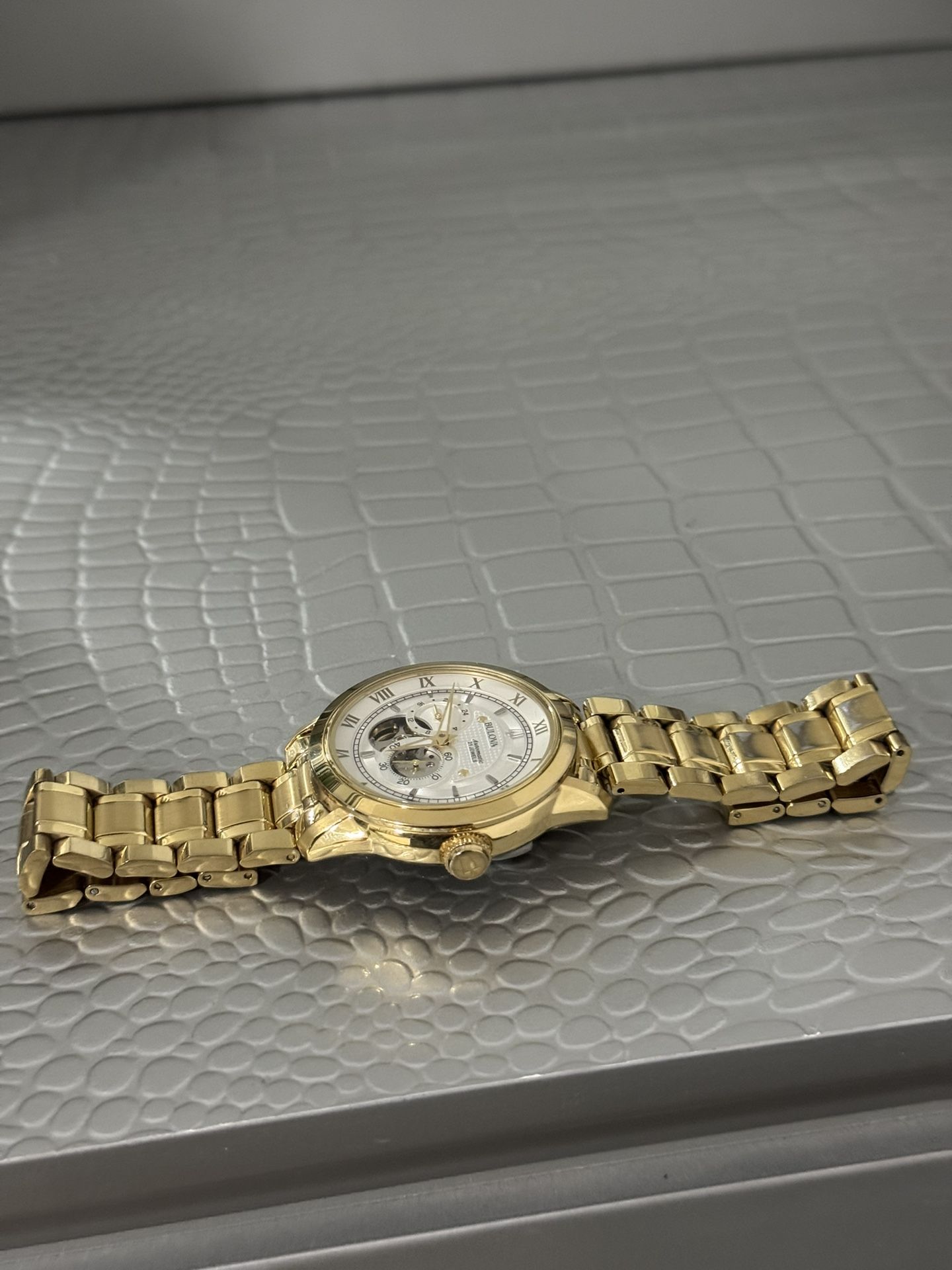 Bulova automatic men’s watch 42mm gold color in very nice condition Sam scratches in bracelet open heart works perfect
