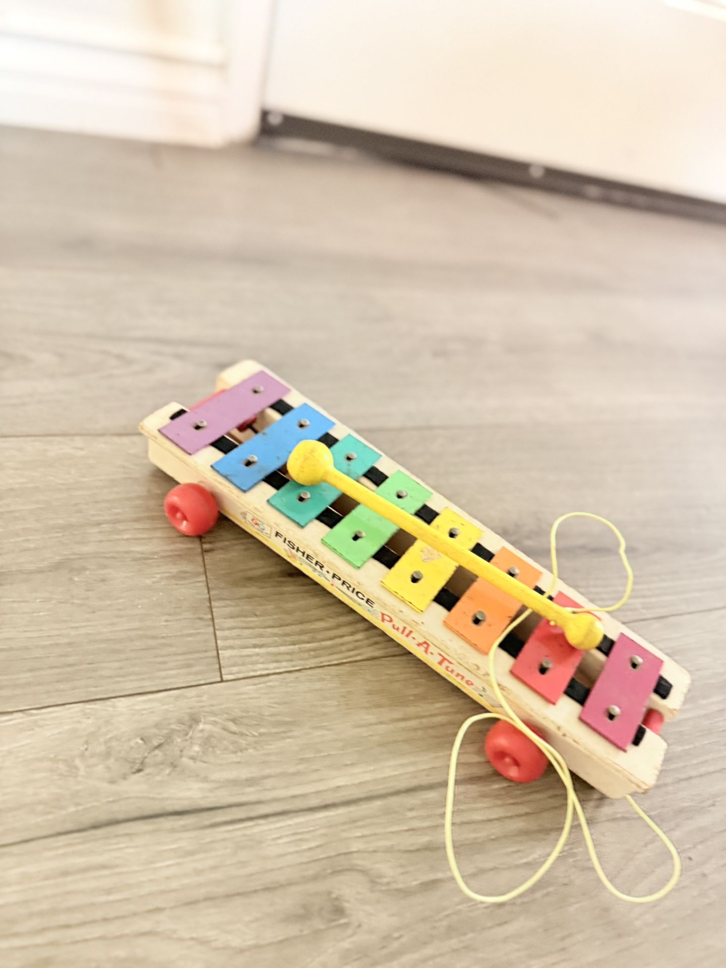 The Fisher-Price Pull-A-Tune Xylophone Pull Toy. Vintage and in great condition! Wheels work great.
