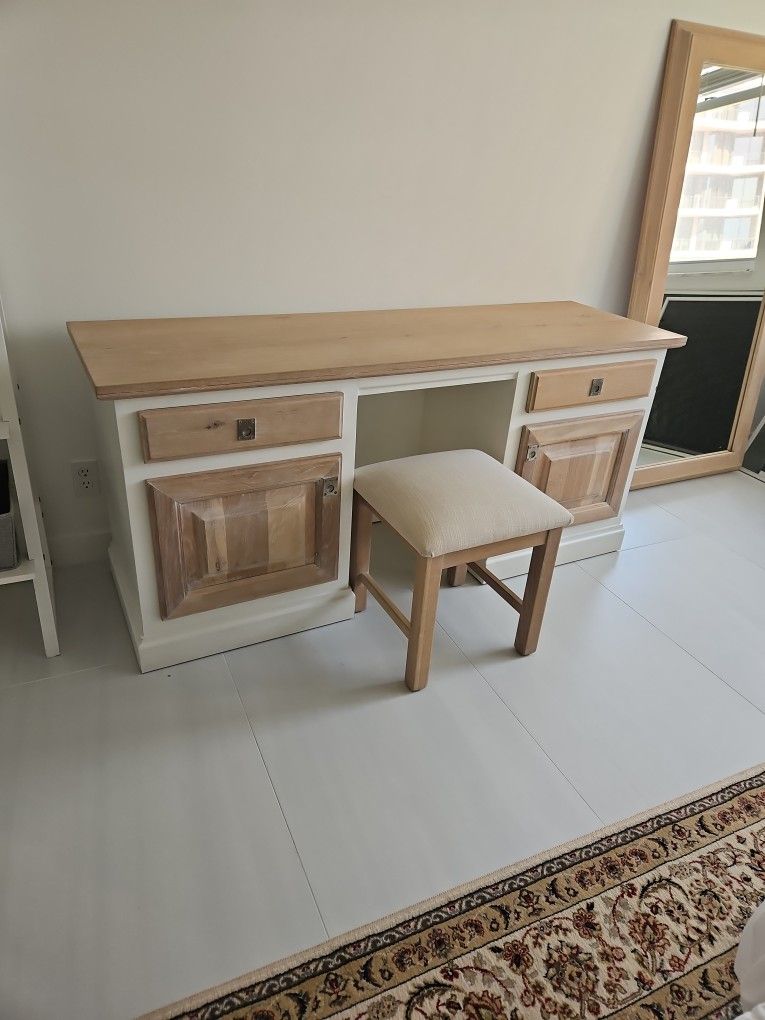 Beautiful Light-colored wood in excellent condition, with a nice comfortable matching stool. Nice place to sit and do your makeup or do your work could go with a different chair?If wanted hardware and drawers in excellent condition, heavy sturdy furniture 65inches wide 20 inches deep 30 inches tall This can be sold on its own or as a set with matching mirror 3 drawer chest and two night stands