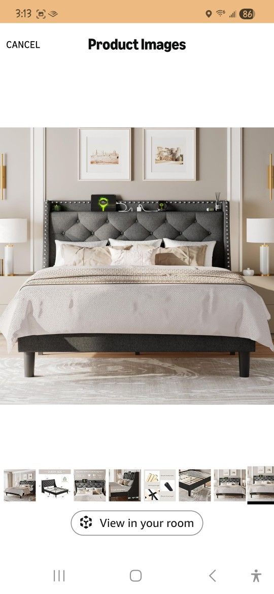 Luxury & Comfortable: 16" wide huge wingback headboard designed with the innovative fashionable nailhead trim and button tufted design, will add sophisticated and fashionable style to any bedroom. Wrapped with high rebound memory sponge, is soft and breathable, providing a cozy backrest experience Storage Headboard with Charging Station: Built-in 2 AC outlets and 2 USB ports, let you charge within your reach. Besides, the top of the headboard leaves 4" storage space, making it convenient for you to place commonly used items, such as books, phones, cameras, etc Stable and Durable: Composed of the solid metal frame and central cross design of 12 thickened wooden slats, reinforce the sturdiness and durability of this queen size platform bed Saving Space: The queen bed 8" extra underbed storage space provides enough space for storing items, and is great for storing boxes, shoes, etc, keeping your room tidy and clutter-free Noise-Free & Easy Assembly: EVA strips between the slats and metal frame provide cushioning resulting in noise-free use. All slats are attached by Velcro. All pieces come with sequence numbers that can easily be done by one person within 30mins
