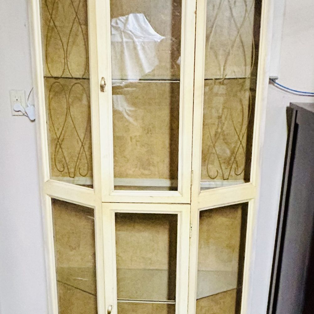 Vintage 1970’s six glass panel, two with gold scrolling, curio / display cabinet, in an antique cream finish with gold trim and knobs. Inside has a working brass accent light at top and three glass shelves. Overall in good, sturdy condition. Some markings and blemishes due to age and use. Some staining on base shelf, can easily be painted or covered with felt (see photos). The piece is unmarked, but dated on back, ‘7-15-74’. Dimensions 72”h x 34.5”w x 12.5”d, fairly light and easy to move.