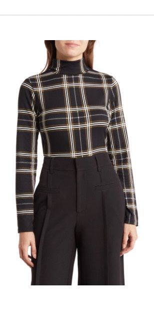 Nordstrom BY DESIGN Turtleneck Long Sleeve Jersey Top BLACK PLAID, Size Medium