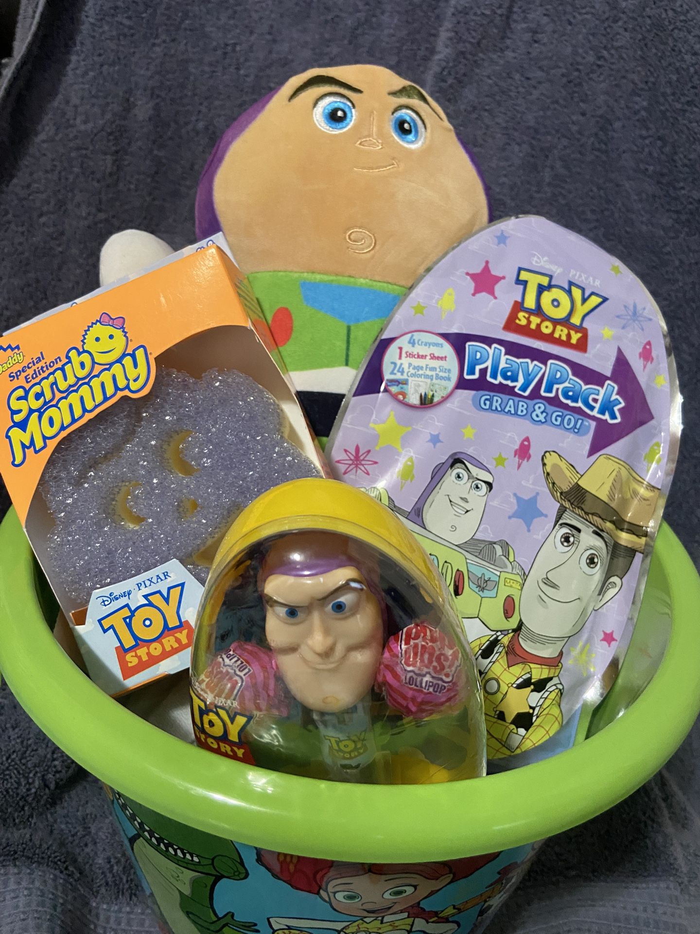 NEW CASH ONLY TOY STORY Easter basket 1-BUZZ LIGHTYEAR squishmallows 1-scrub mommy alien 1-play pack 1-pop ups lollipops Pick Anaheim/La mirada It will be wrap when pick up w a bowl