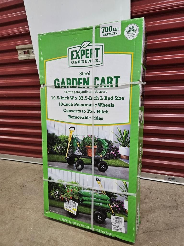 New in box/ priced under retail $90 firm. The Expert Gardener Landscaping Plant and Tool Cart makes it easy to transport tools, plants and more with a sturdy metal cage and heavy-duty tires. This cart can hold up to 700 pounds. The easy-grip handle allows you to direct the cart around corners and down hills to ensure you safely bring your gardening essentials to your work area. When it's time to unload, the cage gates unlock. You can easily slide heavy plants and other items off this durable and versatile landscaping cart onto the ground. This cart's size is 43.9in. x 19.5in. x 39in and weighs 42lbs