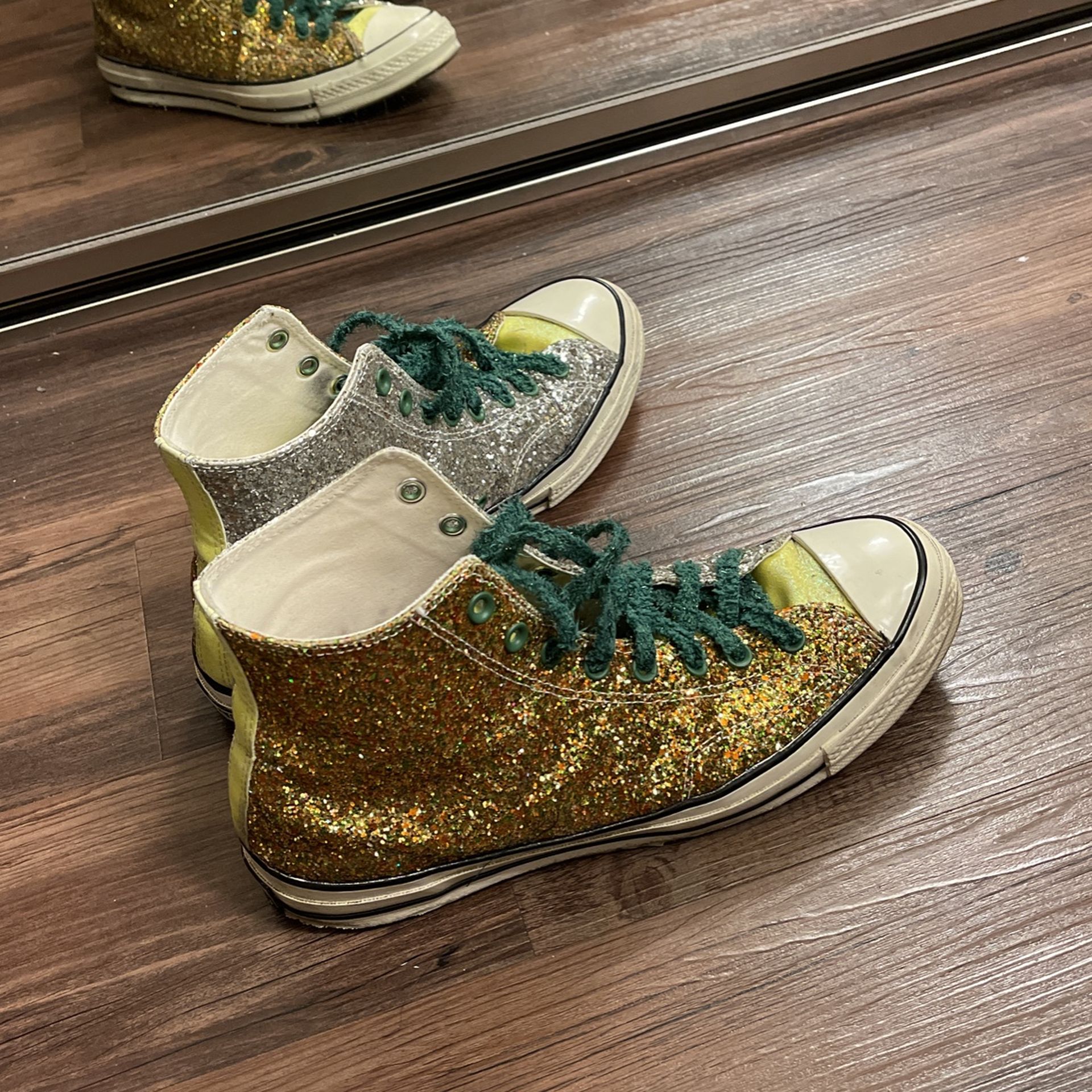 JW Anderson + Converse special edition, gold + silver with neon yellow tongue. Lace with special edition green lace. Normal wear in good condition
