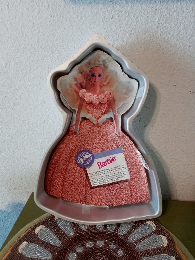 With a plastic upper half of Barbie to finish the cake, and instructions. Never used.