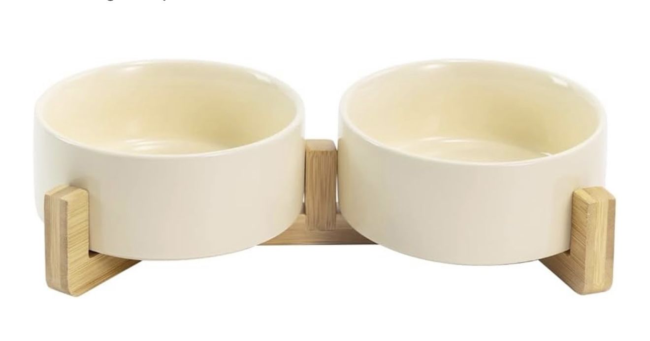SPUNKYJUNKY Ceramic Dog and Cat Bowl Set with Wooden Stand