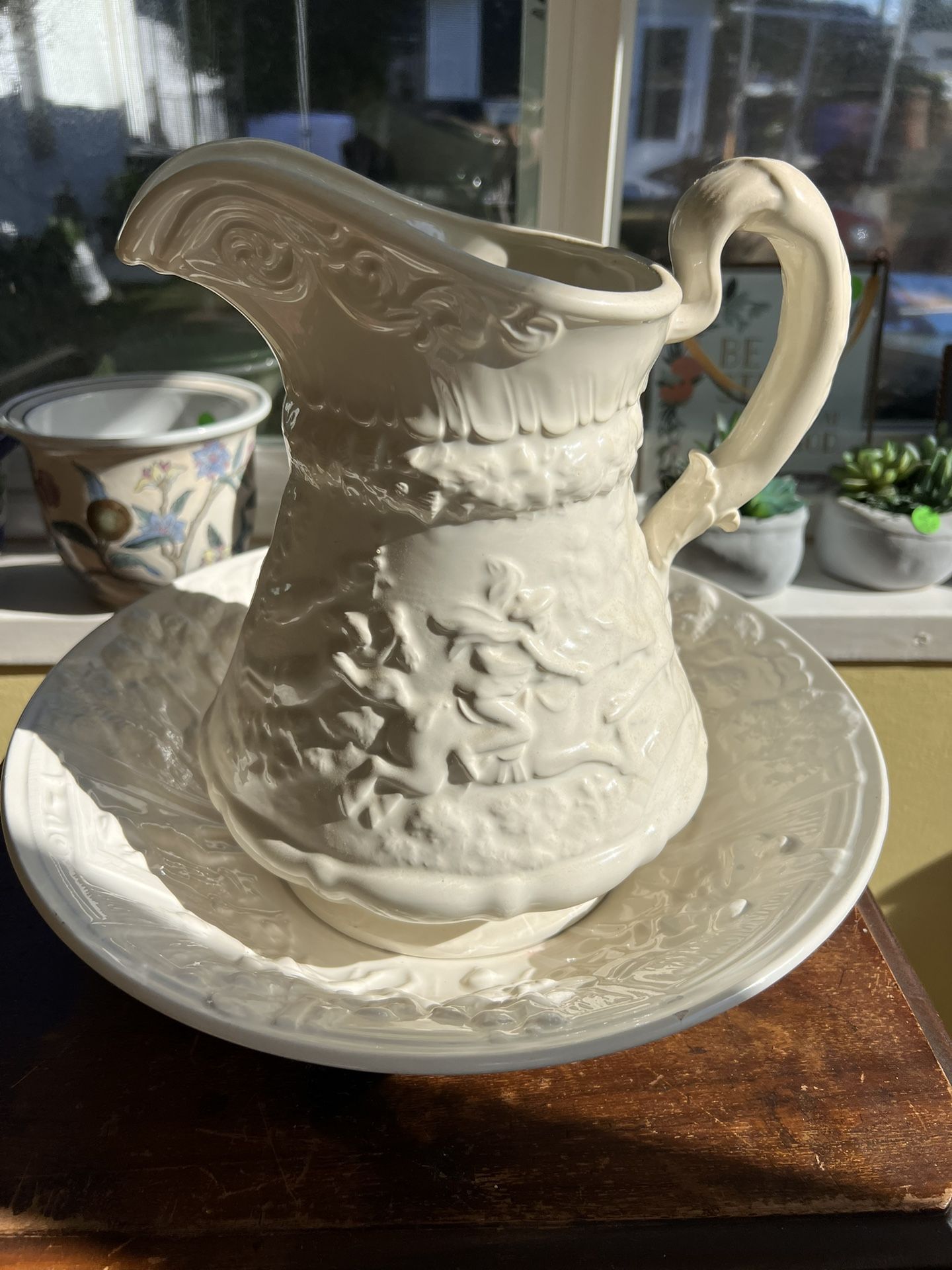 Vintage ceramic pitcher and basin “Witches in Pursuit” Tam O’Shanter. Great condition. Basin 12 3/4” wide Pitcher 10 1/4” tall