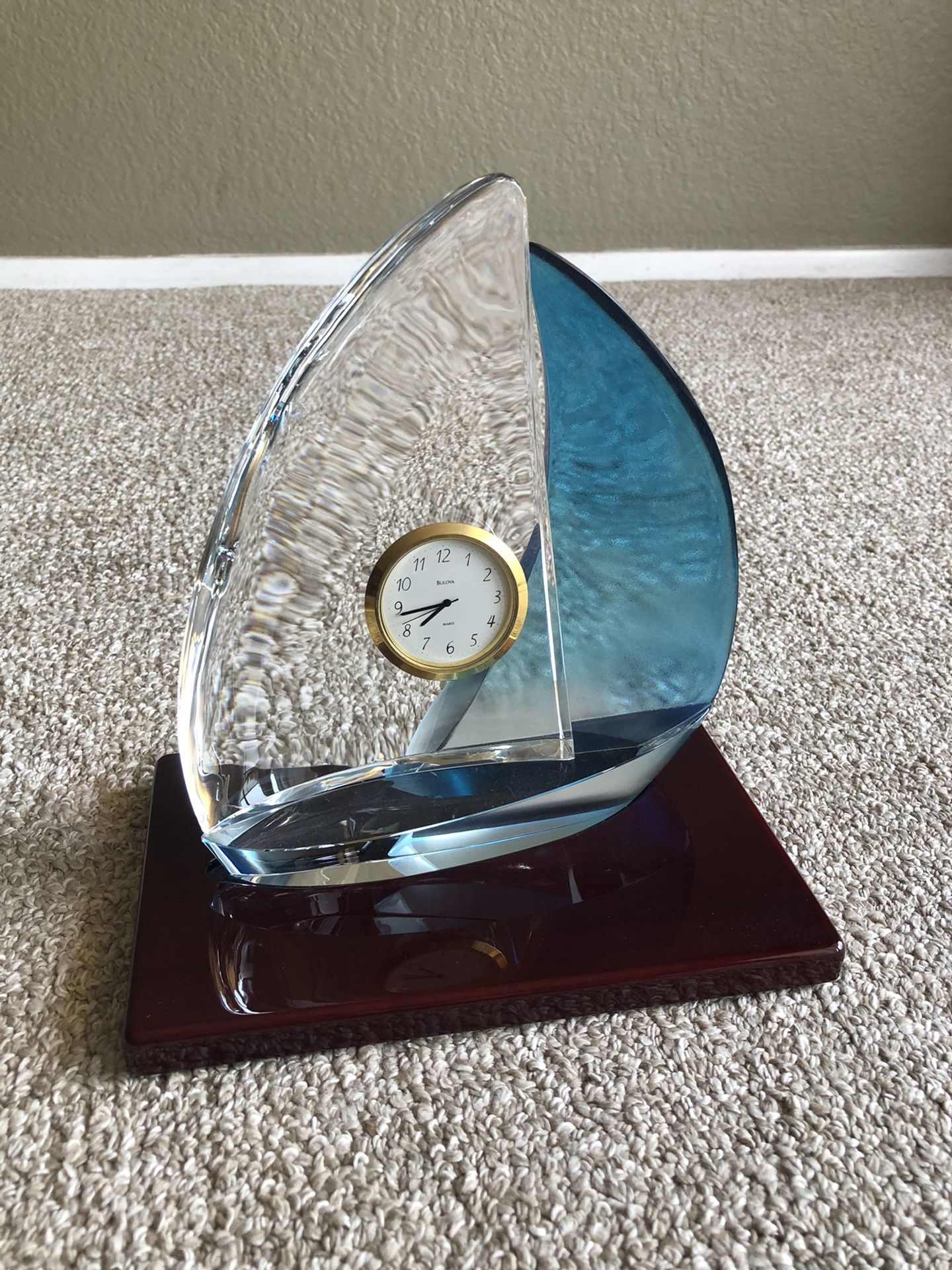 Clear Acrylic two tones Sailboat with analog battery operated clock inserted. Rest on a separate glossy mahogany solid base. Measurements are also shown in separate pictures 8 in wide x 5 in deep x 9 ½ in high