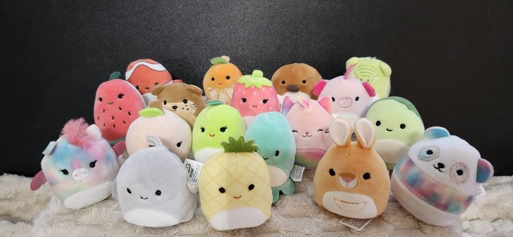 Used/like new Buy as is 18 2 inch mini plush Squishville by Squishmallows Include: Santino platypus Ham the alligator Pastel panda Kelly the kangaroo Maui the pineapple Gordon the shark Zobey the octopus Percy the peacock Phyllis the peach Ashley the green apple Sabrina caticorn Danny the green dinosaur Sheldon the seahorse Scarlett the strawberry Joanne the sea otter Wanda the watermelon Ricky the clown fish Orin the orange