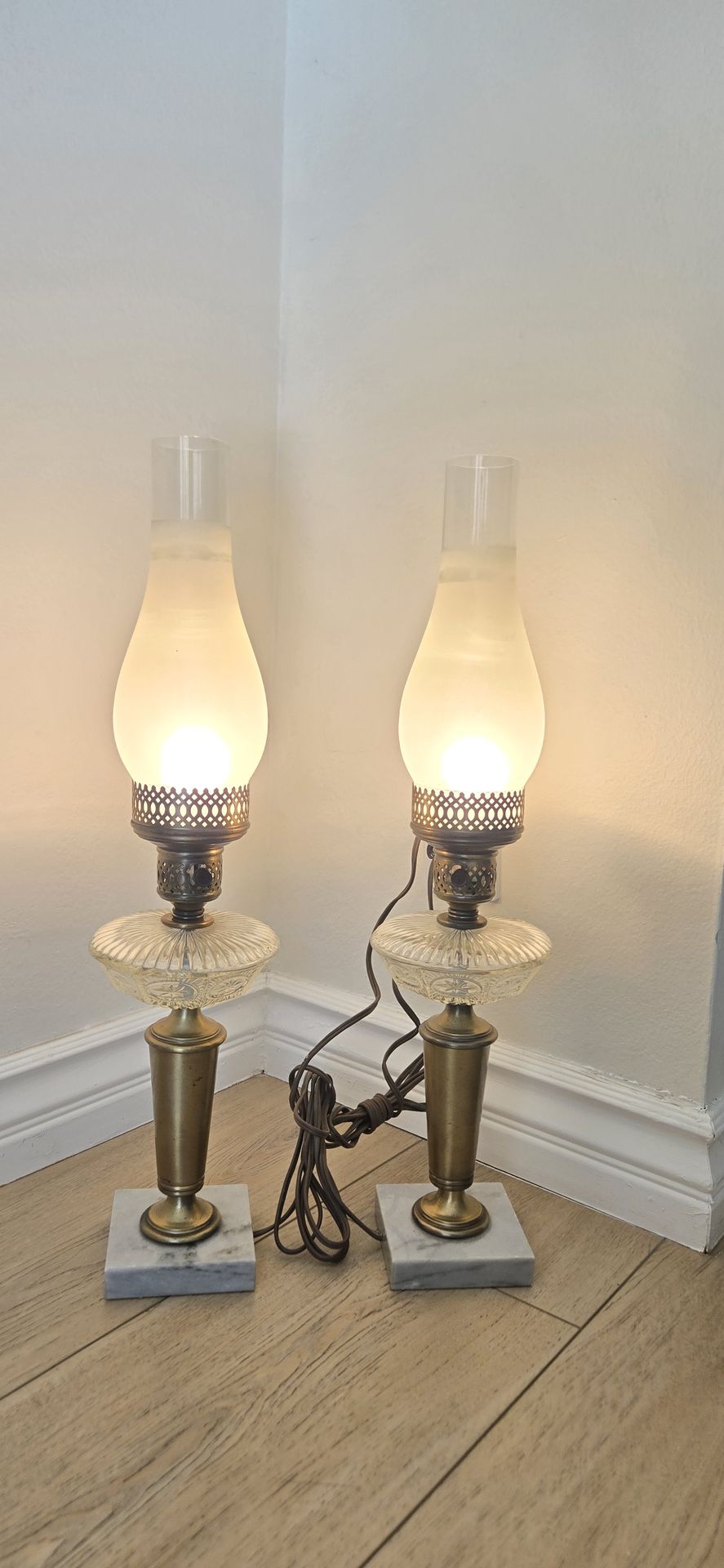 Two Vintage Electric Brass Hurricane Style Lamps With Marble & Crystal Base. In Great Condition.