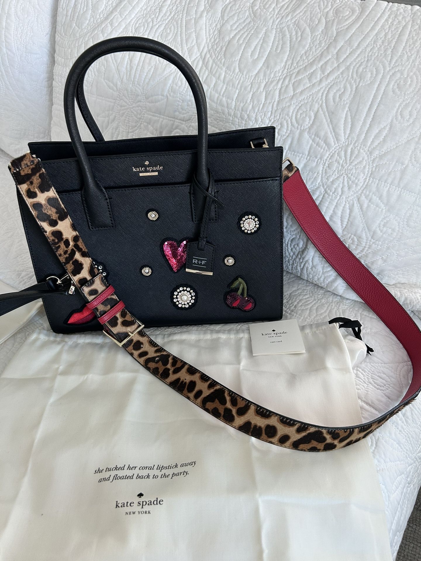 Genuine Rare Kate Spade New York X Rodan & Fields Saffiano Leather Handle Bag purse. Brand New! • Black • Graphic Print • Gold-Tone Hardware • Rolled Handles & Dual Adjustable Shoulder Straps • Embroidered, Sequin & Crystal Accents • Single Exterior Pocket • Jacquard Lining & Three Interior Pockets • Zip Closure at Top • Protective Feet at Base • Includes Dust Bag Height: 9.5" Width: 13" Depth: 5" Great Gift Idea!! Smoke-Free, Pet-free home. $125. Firm