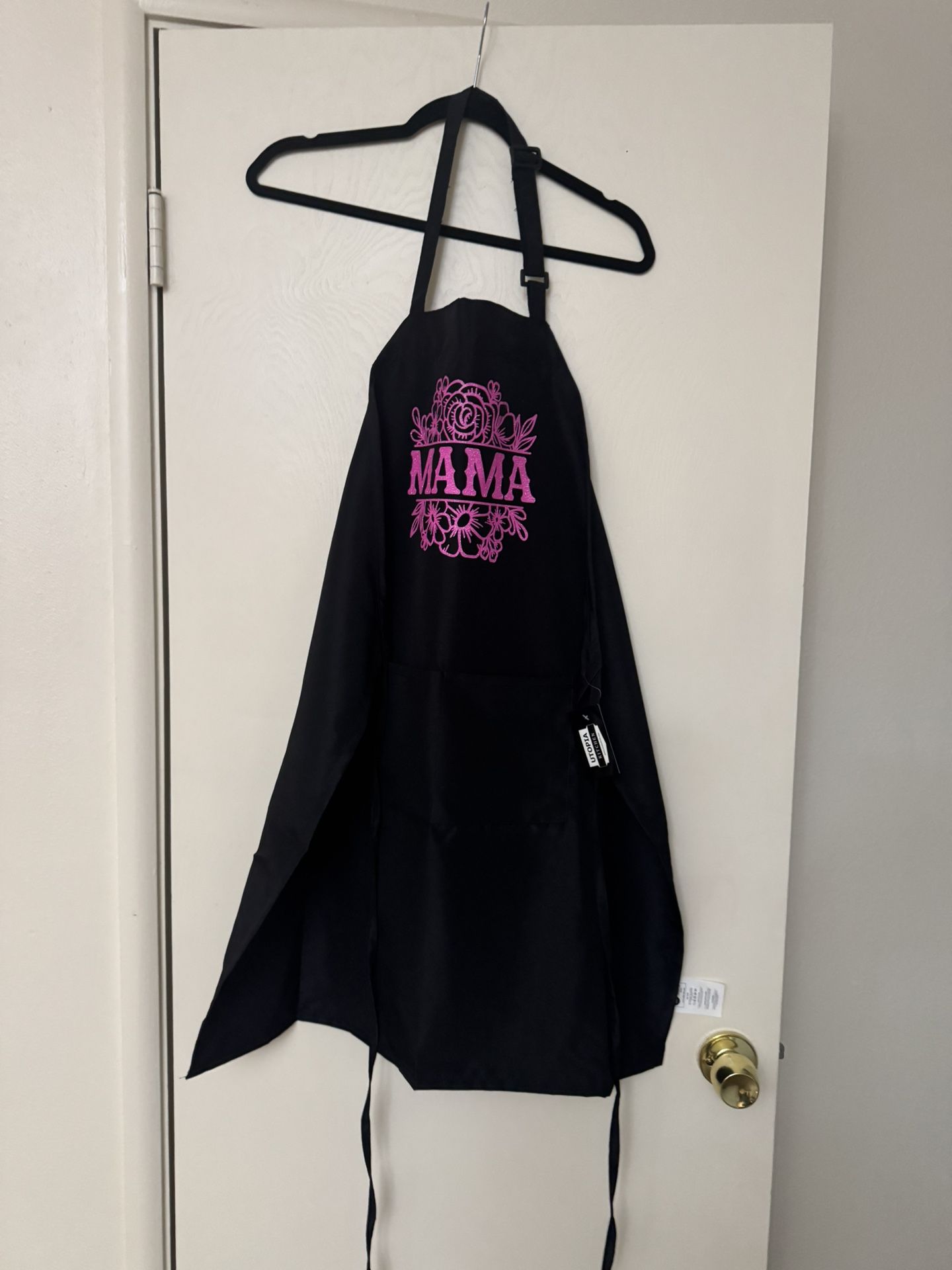 Brand new apron in black with 2 pockets, says Mama in glitter. I have hot pink, light pink and purple. I also make custom orders. Thank you for looking.