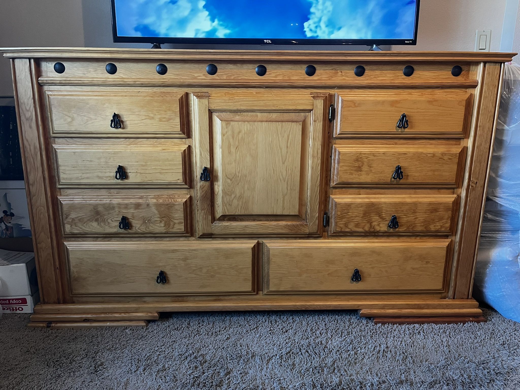Solid Pine Dresser 71”W x 18”D x 41.75”T Small Drawer Dimensions - 18”W x 14.5”D x 3.75”T Large Cabinet Dimension - 18.75”W x 16”D x 21”T Large Drawer Dimensions - 28”W x 15”D x 5.5”T