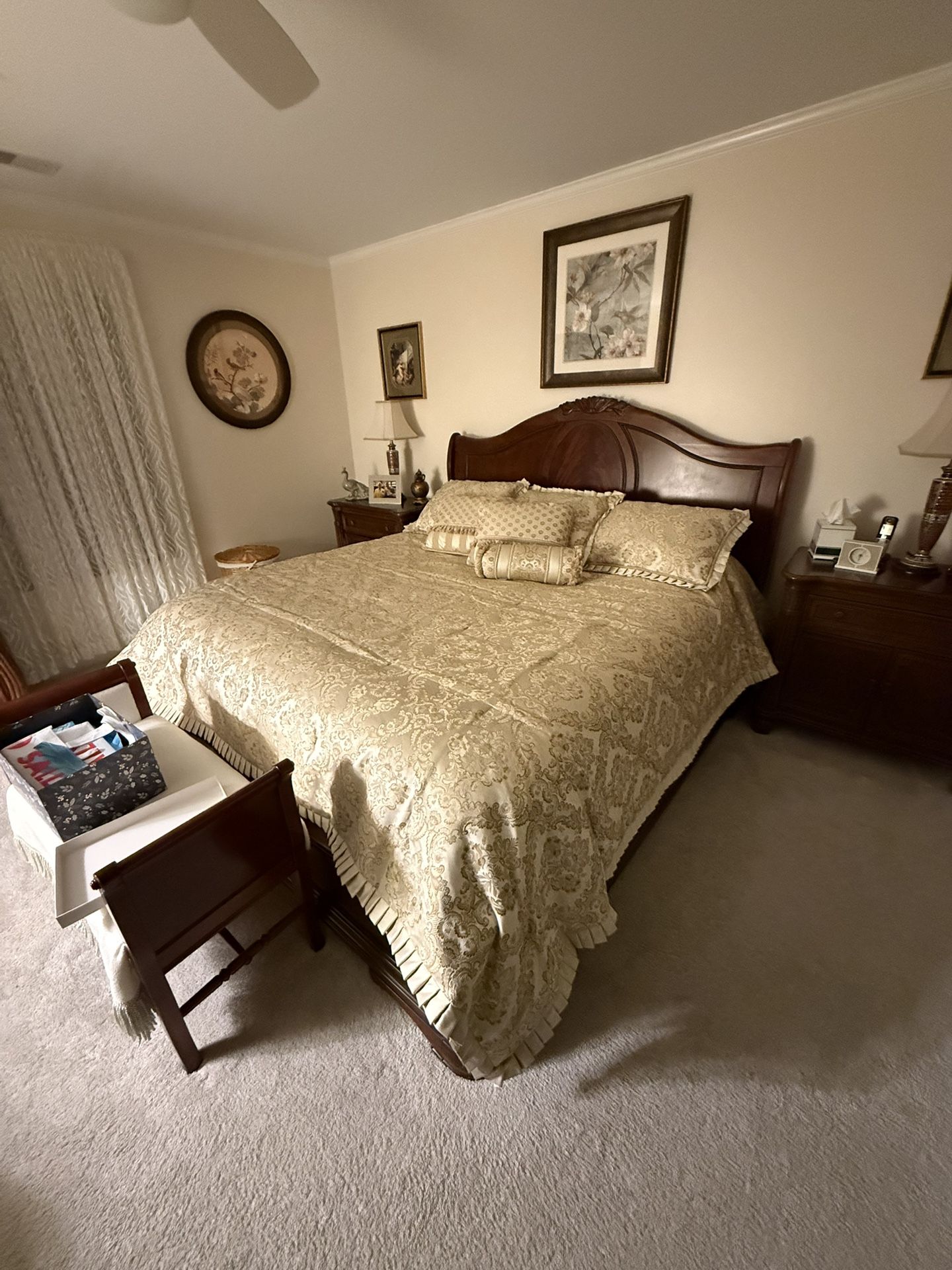 Solid wood, excellent condition, solid wood bedroom set California King Bed (2) Nightstands - 34 x 19 x 31 Dresser - 43 x 20 x 60 Bench Seat