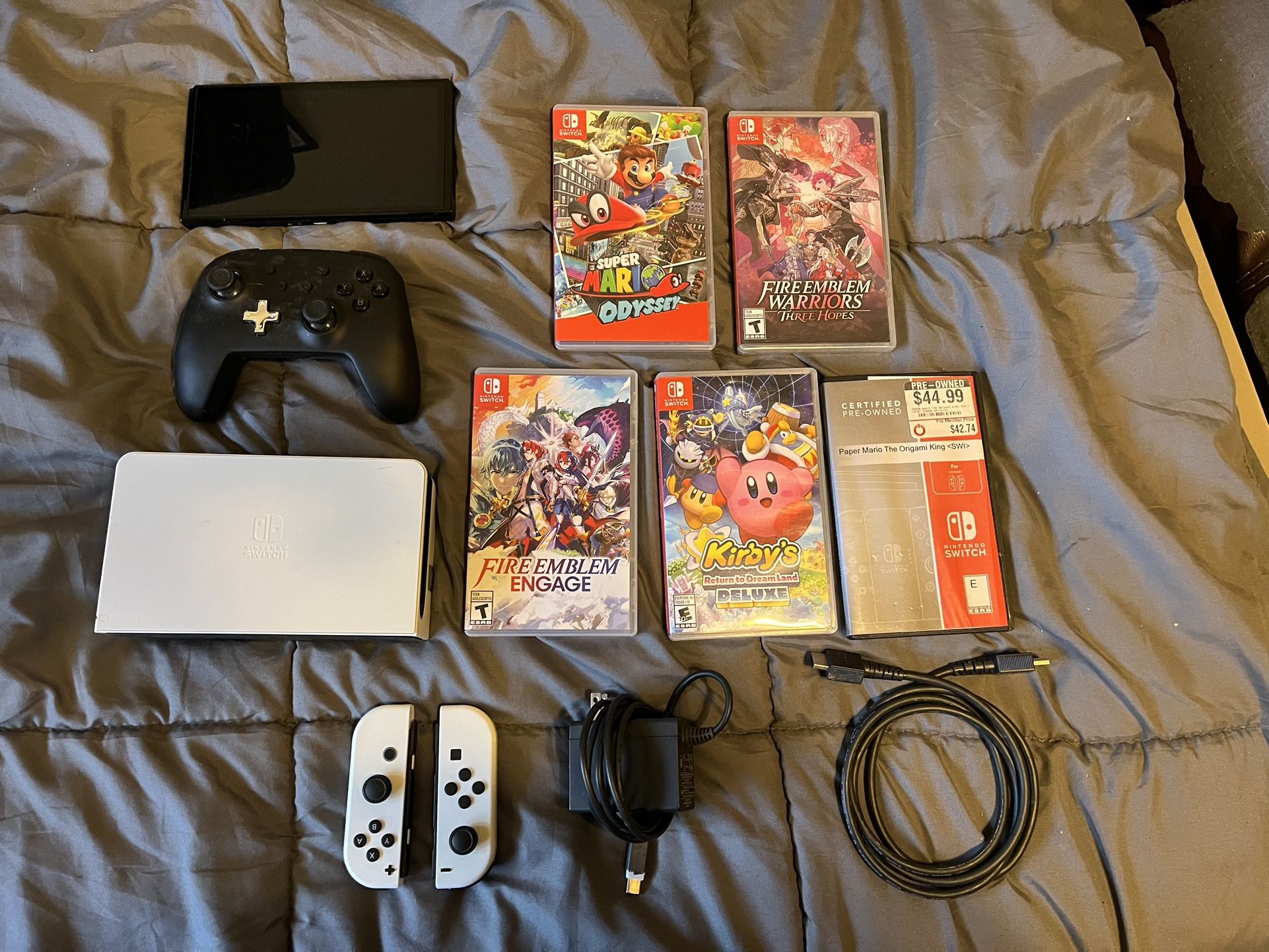 Selling my Nintendo Switch OLED in great condition. White Joy-Cons are originals. No drift. Includes 5 games: • Fire Emblem Warriors: Three Hopes (sealed/unopened) • Fire Emblem Engage • Kirby and the Forgotten Land • Super Mario Odyssey • Paper Mario: The Origami King (preowned case) The games shown on the screen are from my own Nintendo profile. Only listed games are included Original owner, lightly used. Games barely played