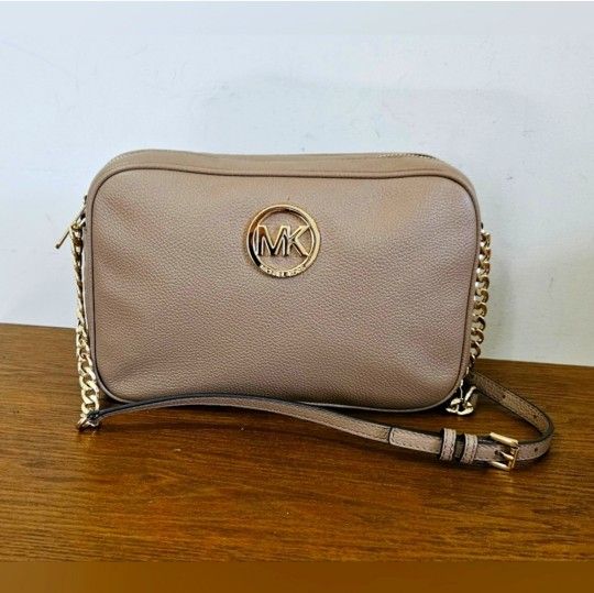 Like New!Michael Kors Beige Pebbled Leather Crossbody Bag,top Zipper closure, interior slip pocket, gold tone hardware, adjustable leather/Chains strap, MK logo in the front. Bag in excellent condition just light stains at the bottom shown in pictures. Size: 9.5"W×6.5"H× 2"D Drop strap: 25.5"