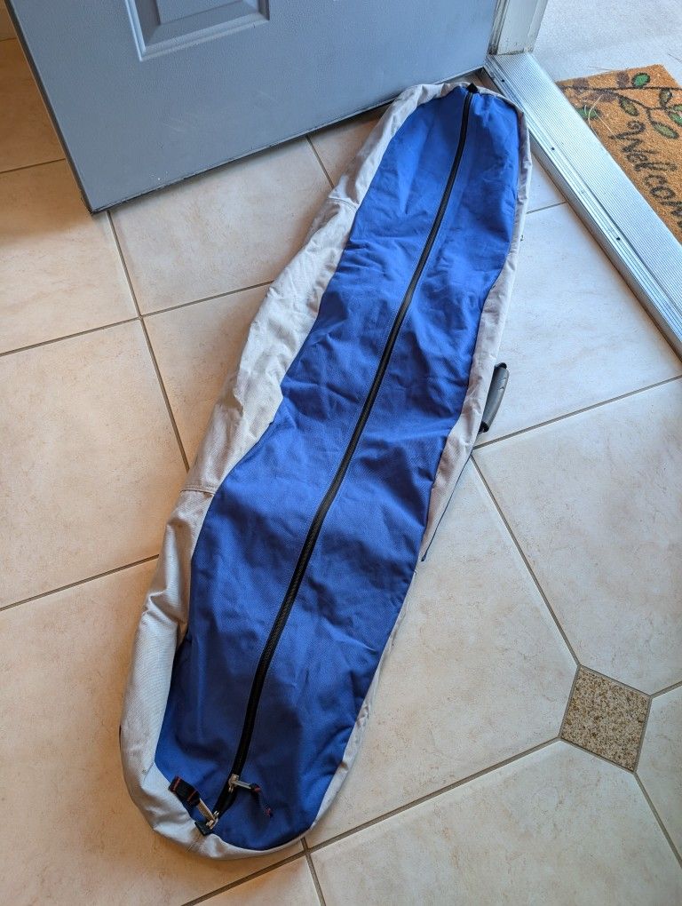 Ski and snowboard bag with internal straps. I measured it to 140 cm. Has a side punch for storing small items. There is also a shoulder strap, not pictured. Used only a handful of times.