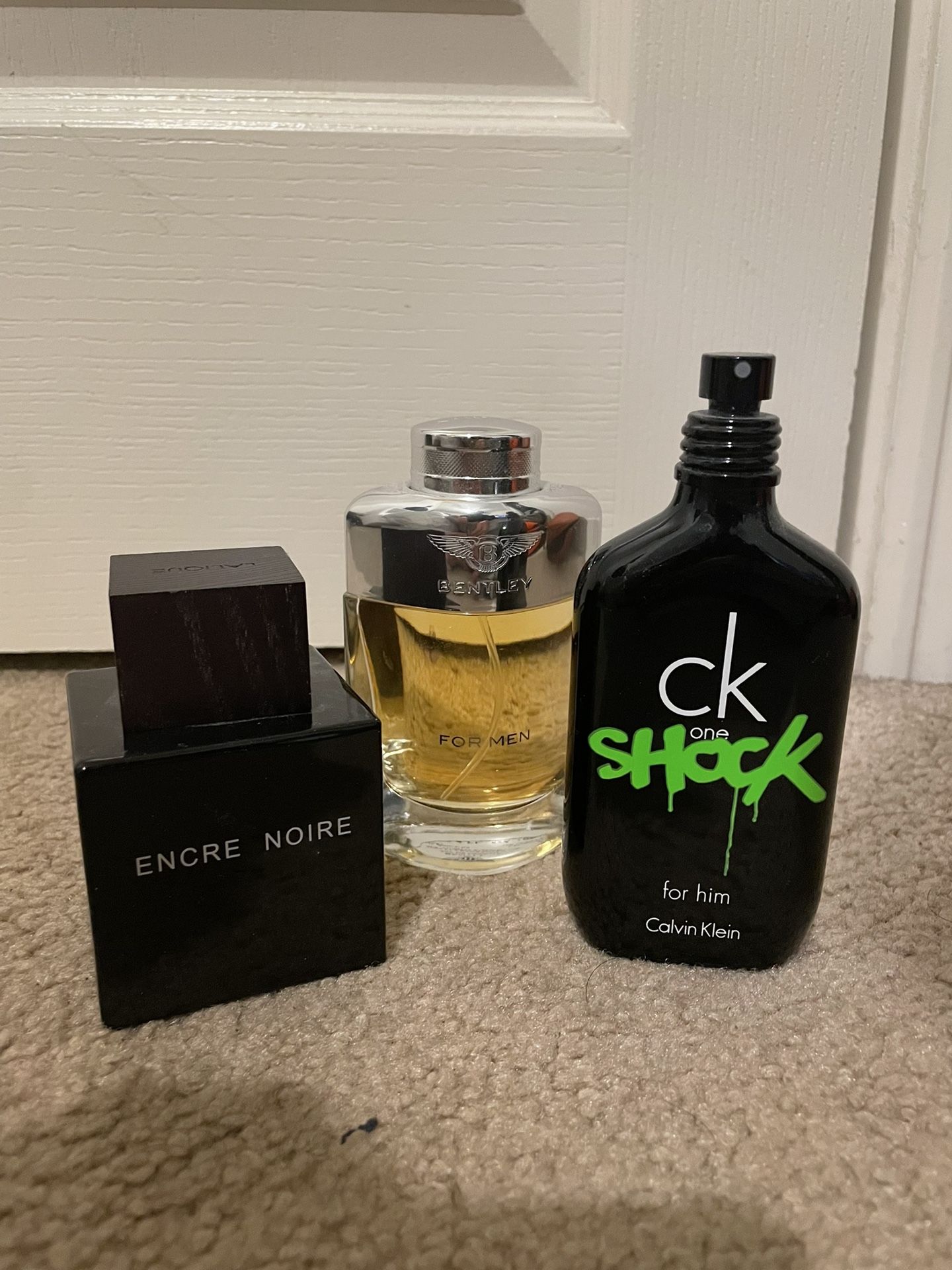 Left to right: Lalique Encre Noire Eau de Toilette 3.4oz, Bentley For Men 3.4oz, Calvin Klein One Shock 3.4oz All have been hardly used, probably less than 10 sprays each. Encre Noire might have been used a few more times. Scents just aren’t for me and they’ve just been sitting. All three brand new would run you about $75.