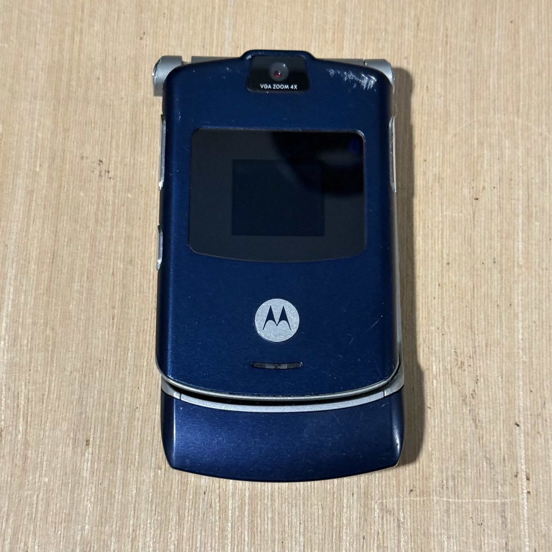 Motorola RAZR V3 Blue Flip Cell Phone w/Clear-Case“UNTESTED” No Charg Read Blw I do not sell working ready to activate phones. I sell vintage phones for collectors. Check with your cell phone company if buying to activate. Buy/Sold as is selling as untested not selling as working no charger 6-10 over condition of the phone. The phone is still in ok condition top of the phone with the screen side top of the Phone does have some scratching on the face and on screen wear and marks on the corners and edges This phone top hinge where the phone flips up is loose see photo for which talking about so top hinge and broken and loose but still usable Back of the phone also has scratching, and light wear around the corner and edges Very rare color phone may need a new battery Comes with clear case Inside the phone, top screen does have scratching on the top. Bottom dials are in good condition to have scratching and wear from regular usage. This phone is untested not sure if working do not have a charger to test out No info on phone if phone can be activated on your network or any other network. no other info on phone please bring the numbers on the back of the phone to see if your cell phone company will activate the phone Buy/Sold as is selling as untested not selling as working no charger Please see photos for condition and size measurements Pick up in Anaheim only public place Thank you take care